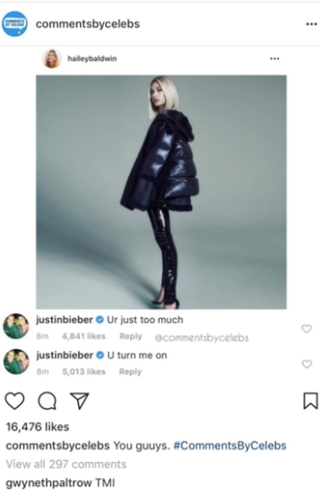 Έτσι όταν είδε το σχόλιο του Τζάστιν Μπίμπερ κάτω από τη φωτογραφία της συζύγου του, ένιωσε ότι ξεπέρασε τα όριά της και του έκανε τη σχετική παρατήρηση. ΤΜΙ (too much infromation), υπερβολικά πολλές πληροφορίες. Ο Τζάστιν σχολίαζε “είσαι τόσο πολύ… με ανάβεις”. Η Γκουίνεθ φρόντισε να τον… σβήσει.