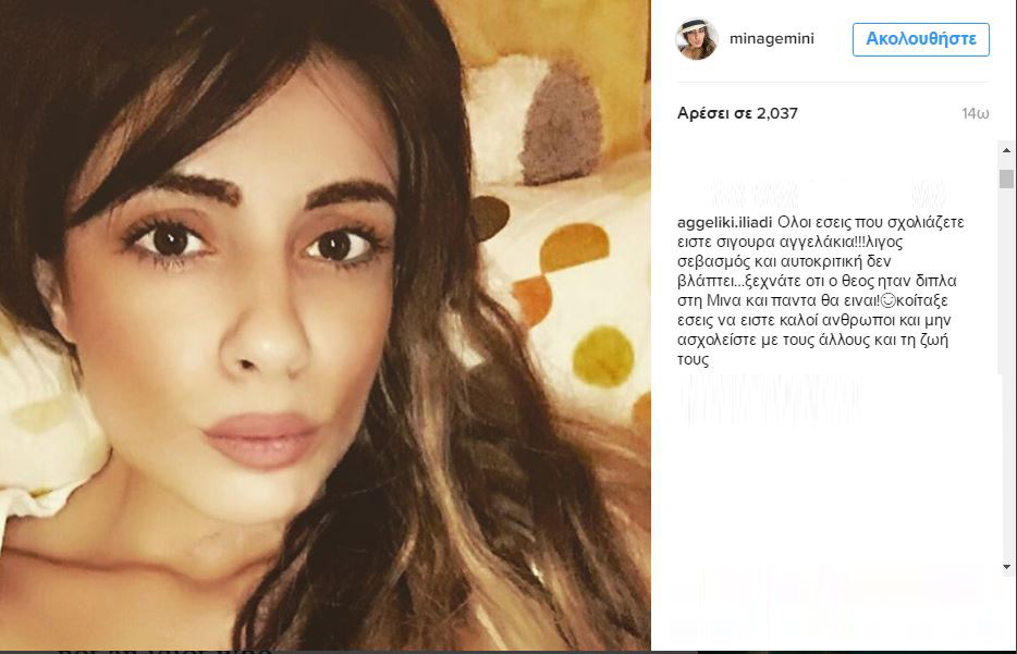 «Όλοι εσείς που σχολιάζετε είστε σίγουρα αγγελάκια!!! λίγος σεβασμός και αυτοκριτική δεν βλάπτει…ξεχνάτε οτι ο Θεός ήταν δίπλα στη Μίνα και πάντα θα είναι! κοίταξε εσείς να είστε καλοί άνθρωποι και μην ασχολείστε με τους άλλους και τη ζωή τους», έγραψε η τραγουδίστρια.