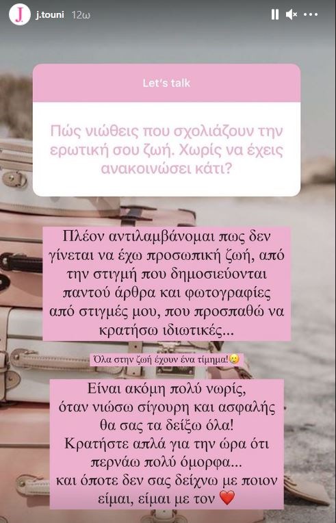 Την πρώτη δήλωση για την προσωπική ζωή της και σε ποια φάση βρίσκεται το τελευταίο διάστημα έκανε η Ιωάννα Τούνη. Η γνωστή influencer σε Q&A που έκανε την Πέμπτη στο Instagram, δέχτηκε ερώτηση σχετικά με τη σχέση της. Σημειώνεται ότι η Ιωάννα Τούνη τον τελευταίο καιρό φέρεται να είναι ζευγάρι με τον Δημήτρη Αλεξάνδρου, αν και επισήμως δημόσια δεν το έχει παραδεχτεί κανείς από τους δύο. Η ερώτηση που έκαναν στην Τούνη είναι η εξής: