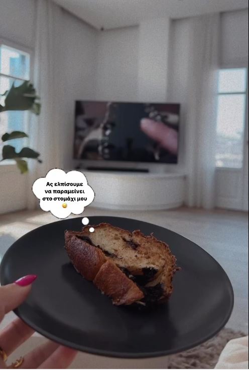 Πριν από λίγο, μέσα από story που δημοσίευσε, έκανε γνωστό πως έχει συχνούς εμέτους και γι’ αυτό δεν μπορεί να φάει τίποτα. Ο γιατρός της έχει συστήσει να τρώει φρυγανιές ωστόσο η ίδια, δεν μπόρεσε να αντισταθεί στο… τσουρέκι με σοκολάτα.