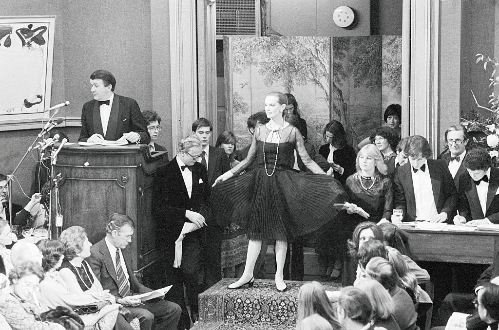 (Original Caption) Coco Chanel’s famous “little black dress,” a short evening dress of black pleated silk chiffon with bootlace straps and a gauze jacket, being shown at the auction of Miss Chanel’s creations and sold for 1,500 pounds ($3,000) at Christie’s sale rooms 12/2. The collection of garments and jewelry reached the total of 68,655 pounds ($138,000).