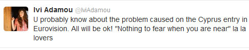“Πιθανώς γνωρίζετε το πρόβλημα που έχει δημιουργηθεί με την συμμετοχή της Κύπρου για την Eurovision. Όλα θα είναι εντάξει! -Μη φοβάσαι τίποτα όταν είσαι κοντά- λα λα αγάπημένοι” Λίγη ώρα αργότερα, η Ήβη έγραψε ξανά στο twitter…