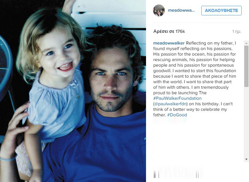 Η 16χρονη Μίντοου Γουόκερ, απέτισε φόρο τιμής στον αδικοχαμένο πατέρα της, ιδρύοντας τον οργανισμό με όνομα «The Paul Walker Foundation».