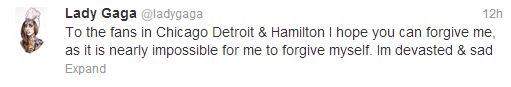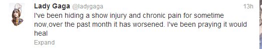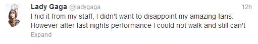 Η Lady Gaga δεν μπορεί να περπατήσει και ακύρωσε τις επερχόμενες συναυλίες της. Την ανακοίνωση έκανε η ίδια μέσα από το twitter.