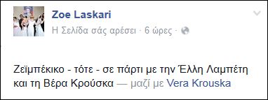 Η Ζωή Λάσκαρη ανέβασε μια παλιά φωτογραφία στην προσωπική της σελίδα στο Facebook με την σπουδαία Έλλη Λαμπέτη και τη Βέρα Κρούσκα. Όπως εξηγεί η γνωστή ηθοποιός είχε τραβηχτεί σε ένα πάρτι, όπου η ίδια χορεύει ζεϊμπέκικο.