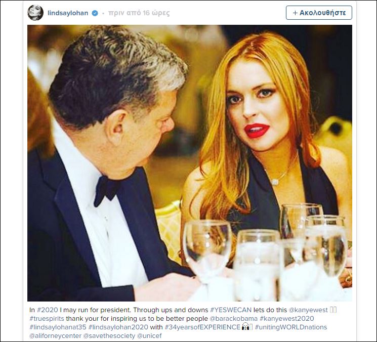 Η ηθοποιός, τραγουδίστρια και μοντέλο που είχε πολλές φορές στο παρελθόν προβλήματα με τη δικαιοσύνη για κατάχρηση ναρκωτικών ουσιών, αποκάλυψε τα σχέδιά της μέσω Instagram. Η 29χρονη Λίλο, ανέβασε μία φωτογραφία της από τον Δείπνο των Ανταποκριτών στο Λευκό Οίκο το 2012 γράφοντας: “Το # 2020 μπορεί να θέσω υποψηφιότητα για πρόεδρος. Μέσα από σκαμπανεβάσματα #YESWECAN ας το κάνουμε αυτό kanyewest”.
