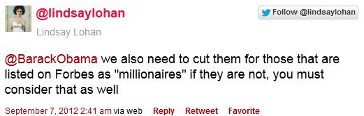 ” Έχω μειώσει τους φόρους, για εκείνους που το χρειάζονται: τις μεσοαστικές οικογένειες και τις μικρές επιχειρήσεις”.Προφανώς, όταν έγραφε αυτό το κείμενο, δεν περίμενε, ότι απεναντί του θα έβρισκε την Lindsay Lohan, με την εξής απάντηση :