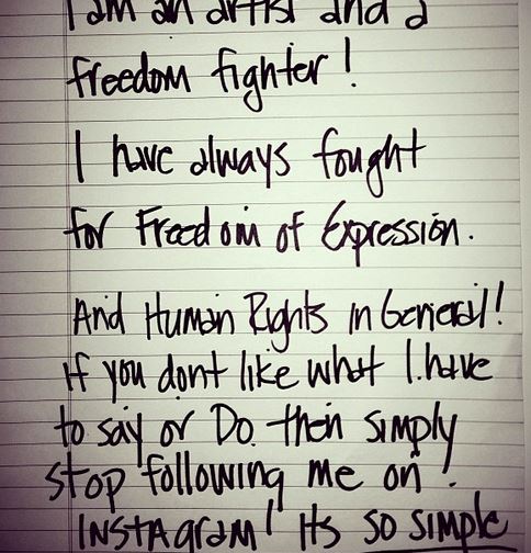 “Είμαι καλλιτέχνης και υπέρμαχος των δικαιωμάτων. Από πάντα έδινα μάχη για την ελευθερία της έκφρασης και γενικότερα για τα ανθρώπινα δικαιώματα. Αν δεν σας αρέσει αυτά που γράφω ή αυτά που κάνω, σταματήστε να με ακολουθείτε στο Instagram. Είναι τόσο απλό”.