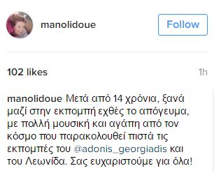 “Μετά από 14 χρόνια, ξανά μαζί στην εκπομπή εχθές το απόγευμα, με πολλή μουσική και αγάπη από τον κόσμο που παρακολουθεί πιστά τις εκπομπές του Άδωνι Γεωργιάδη και του Λεωνίδα. Σας ευχαριστούμε για όλα” έγραψε η Ευγενία Μανωλίδου.