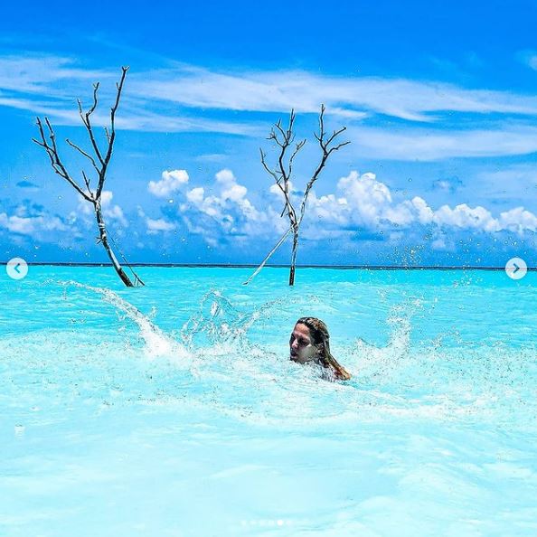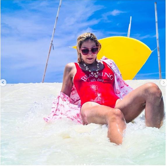 Έτσι δημοσίευσε φωτογραφίες της με ολόσωμο κόκκινο μαγιό αλά Πάμελα Άντερσον στη θρυλική σειρά Baywatch.