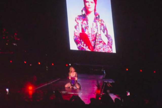 «Θέλω να αποτίνω φόρο τιμής στον άνδρα που με ενέπνευσε να κάνω την καριέρα μου, είπε η βασίλισσα της ποπ στο πλήθος». «Αν δεν έχετε ακούσει David Bowie, τότε δείτε τον», συνέχισε, δείχνοντας το σκηνικό πίσω της.