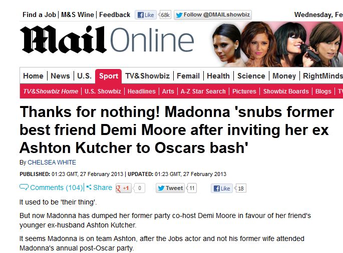 Η Μαντόνα έριξε άκυρο στη Ντέμι Μουρ και μάλιστα για να την πικάρει κάλεσε στο πάρτι της μετά τα βραβεία Όσκαρ τον πρώην της ηθοποιού, Άστον Κούτσερ.