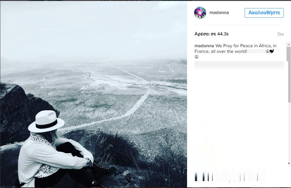 Η Μαντόνα έγραψε στο instagram: «Προσευχόμαστε για ειρήνη στην Αφρική, στην Γαλλία και σε όλον τον κόσμο!».