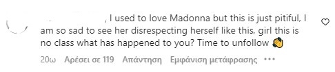 «Τι είναι αυτό; Είναι τόσο λυπηρό να σε βλέπω να καταστρέφεις το εμβληματικό στυλ της Madonna! Λυπάμαι που είμαι θαυμαστής σου από τότε που ήμουν παιδί… και δεν μπορώ να δεχτώ αυτό το σκουπίδι στυλ. Δεν έχει κανένα νόημα… κανένα βάθος… αυτό δεν είναι Τέχνη… καταστρέφεις την εμβληματική Μαντόνα που δημιούργησες!» έγραψε ένας χρήστης στην δημοσίευσή της, ενώ ένας άλλος ανέφερε: «Παλιά αγαπούσα την Μαντόνα, αλλά αυτό είναι απλώς λυπηρό, είμαι τόσο λυπημένος που την βλέπω να μην σέβεται τον εαυτό της έτσι, κορίτσι μου αυτό δεν είναι επίπεδο τι σου συνέβη; Ώρα για να κάνω unfollow».