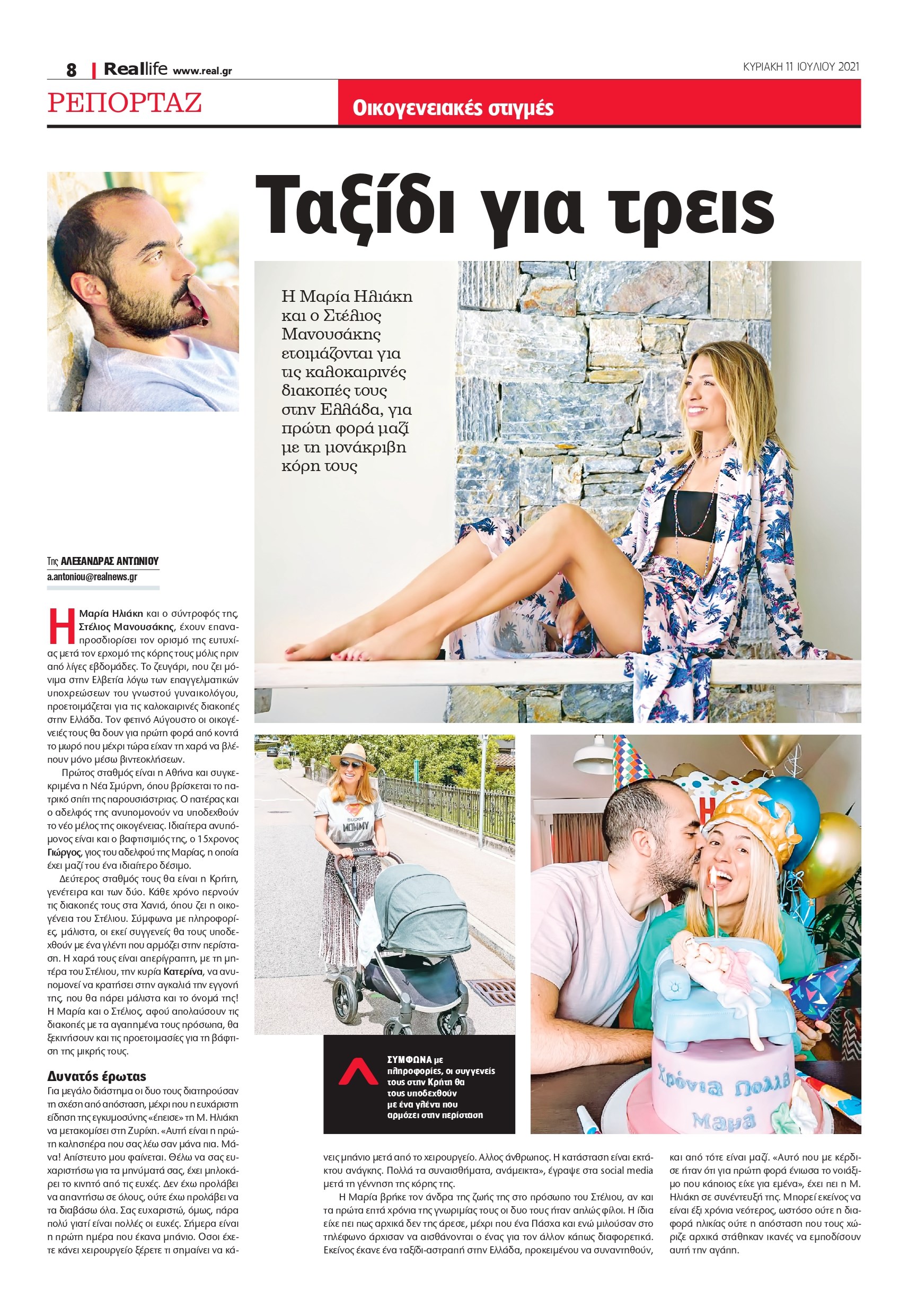 Η Μαρία Ηλιάκη και ο σύντροφός της, Στέλιος Μανουσάκης, έχουν επαναπροσδιορίσει τον ορισμό της ευτυχίας μετά τον ερχομό της κόρης τους μόλις πριν από λίγες εβδομάδες. Το ζευγάρι, που ζει μόνιμα στην Ελβετία λόγω των επαγγελματικών υποχρεώσεων του γνωστού γυναικολόγου, προετοιμάζεται για τις καλοκαιρινές διακοπές στην Ελλάδα. Τον φετινό Αύγουστο οι οικογένειές τους θα δουν για πρώτη φορά από κοντά το μωρό που μέχρι τώρα είχαν τη χαρά να βλέπουν μόνο μέσω βιντεοκλήσεων. Πρώτος σταθμός είναι η Αθήνα και συγκεκριμένα η Νέα Σμύρνη, όπου βρίσκεται το πατρικό σπίτι της παρουσιάστριας. Ο πατέρας και ο αδελφός της ανυπομονούν να υποδεχθούν το νέο μέλος της οικογένειας. Ιδιαίτερα ανυπόμονος είναι και ο βαφτισιμιός της, ο 15χρονος Γιώργος, γιος του αδελφού της Μαρίας, η οποία έχει μαζί του ένα ιδιαίτερο δέσιμο.