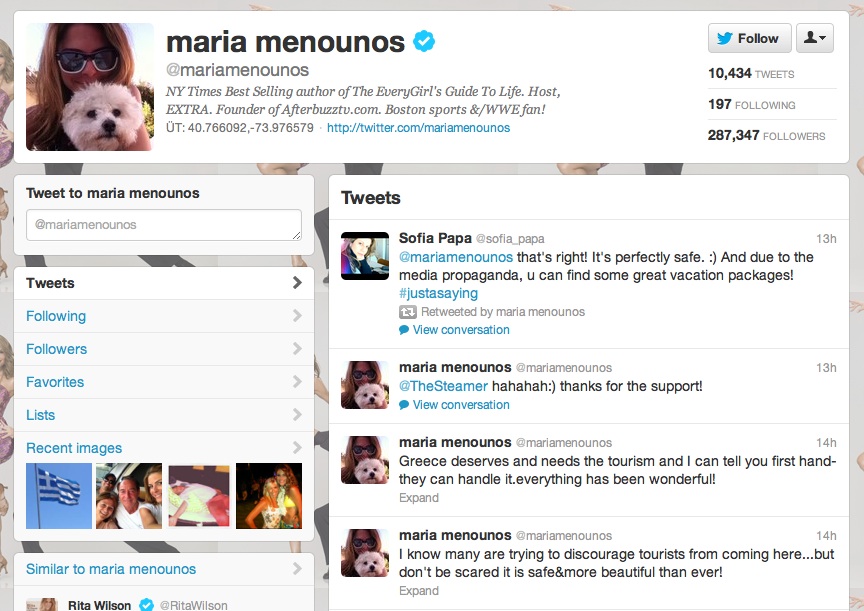 Η Μαρία Μενούνος βρίσκεται στα πάτρια εδάφη αυτόν τον καιρό για ολιγοήμερες διακοπές και, με την ευκαιρία, καλεί τους φίλους της και τους χιλιάδες followers του λογαριασμού της στο twitter να έρθουν στην Ελλάδα…”Αν προσπαθείτε να αποφασίσετε που θα πάτε φέτος το καλοκαίρι-μπορώ να σας προτείνω-την Ελλάδα! Είναι απίστευτα εδώ!!! Έχω πάει σε πολλά μέρη-τίποτα δεν την ξεπερνάει”, γράφει η Μαρία στο twitter της.”Ξέρω ότι πολλοί προσπαθούν να αποθαρρύνουν τους τουρίστες να έρθουν εδώ… αλλά μη φοβάστε. Η Ελλάδα είναι ασφαλές μέρος και πιο όμορφο από ποτέ!”, συνέχισε η 34χρονη παρουσιάστρια.