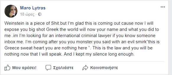 «Ο Γουάνστιν είναι ένα απόβρασμα. Είμαι, όμως, χαρούμενη που αυτή η ιστορία ήρθε στο φως γιατί τώρα θα σε εκθέσω σε όλους, Έλληνα. Ο κόσμος θα μάθει το όνομά σου και τι έκανες σε εμένα. Ψάχνω έναν δικηγόρο διεθνούς ποινικού δικαίου. Αν γνωρίζετε κάποιον, στείλτε μου μήνυμα. Θα σε κυνηγήσω τέρας! Μου είχες πει με ένα κακεντρεχές μειδίαμα: «εδώ είναι Ελλάδα, γλυκιά μου, δεν είσαι τίποτα εδώ». Αυτός είναι ο νόμος και δεν θα είσαι εσύ τίποτα τώρα που θα μιλήσω. Και έμεινα σιωπηλή για πολύ καιρό!», γράφει στην ανάρτησή της η Ελληνοκαναδή τραγουδίστρια.