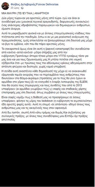 Έκκληση για την οικονομική στήριξη των καλλιτεχνών απευθύνει ο τραγουδοποιός Φοίβος Δεληβοριάς. Με ανάρτηση που έκανε στον προσωπικό του λογαριασμό στο facebook με τίτλο «Μία μαύρη (τελευταία;) ανάρτηση», ανακοινώνει στους θαυμαστές του ότι αναστέλλει τη λειτουργία της σελίδας του μέχρι να βρεθεί λύση για τους καλλιτέχνες τονίζοντας ότι “οδηγούμαστε στην απόλυτη φτώχεια και δυστυχία”.