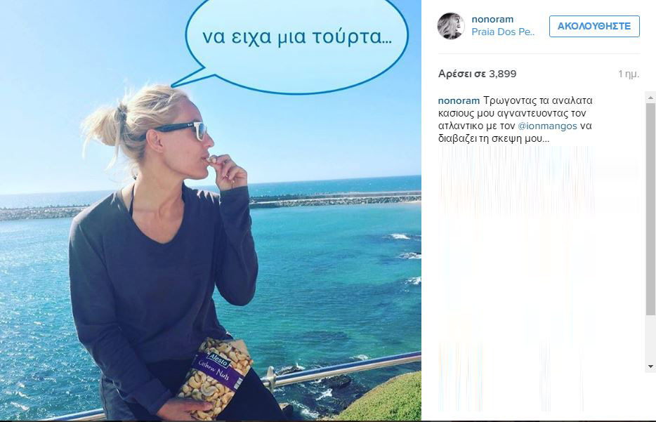 Στη λεζάντα της ανάρτησής της, η παρουσιάστρια έγραψε «τρώγοντας τα ανάλατα κάσιους μου, αγναντεύοντας τον ατλαντικό με τον Ίων να διαβάζει τη σκέψη μου…».