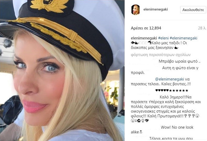 Η Ελένη Μενεγάκη εγκατέλειψε την Αθήνα για το τριήμερο της Πρωτομαγιάς και δεν μπορεί να κρύψει τον ενθουσιασμό της.Η παρουσιάστρια, ανέβασε μία φωτογραφία στον προσωπικό της λογαριασμό στο Instagram, στην οποία φορά ένα καπέλο… καπετάνιου! Κάτι το οποίο προδίδει ότι θα περάσει στιγμές χαλάρωσης με την οικογένειά της, σε κάποιο νησί.«Καλό μας ταξίδι! Οι διακοπές μας ξεκίνησαν!», ήταν η λεζάντα που συνόδευε τη φωτογραφία της αγαπημένης παρουσιάστριας.