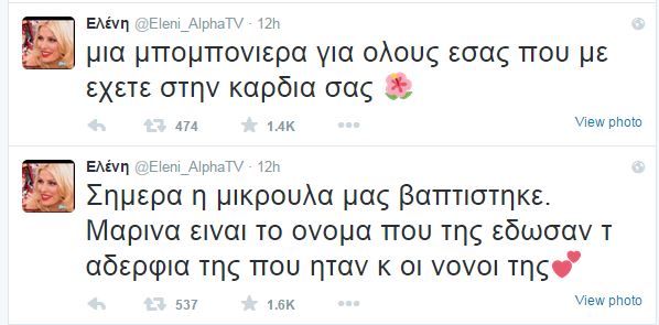 Η παρουσιάστρια πόσταρε στο twitter φωτογραφίες από την βάφτιση και αποκάλυψε το όνομά της μικρής. Νονοί της Μαρίνας ήταν τα τρία μεγαλύτερα αδέλφια της, Άγγελος, Λάουρα και Βαλέρια, όπως έγραψε η Μενεγάκη στο twitter.