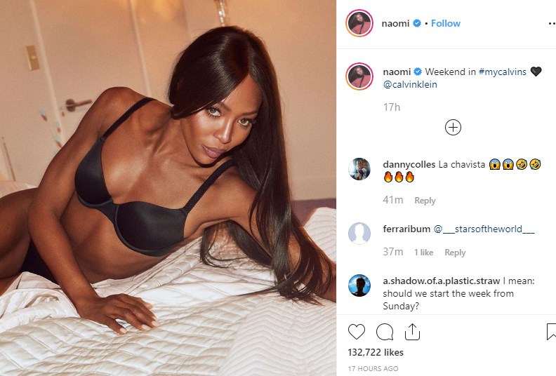 Μόνο ένα σετ μαύρα εσώρουχα επέλεξε να φορέσει η Ναόμι Κάμπελ και να δημοσιεύσει τη φωτογραφία στον λογαριασμό της στο instagram.