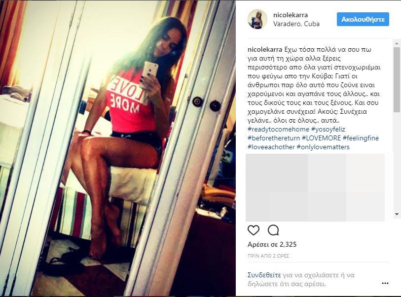 «Έχω τόσα πολλά να σου πω για αυτή τη χώρα αλλά ξέρεις περισσότερο από όλα γιατί στενοχωριέμαι που φεύγω από την Κούβα; Γιατί οι άνθρωποι παρ’ όλο αυτό που ζούνε είναι χαρούμενοι και αγαπάνε τους άλλους.. και τους δικούς τους και τους ξένους. Και σου χαμογελάνε συνέχεια! Ακούς; Συνέχεια γελάνε.. όλοι σε όλους.. αυτά..», έγραψε δίπλα από τη φωτογραφία.