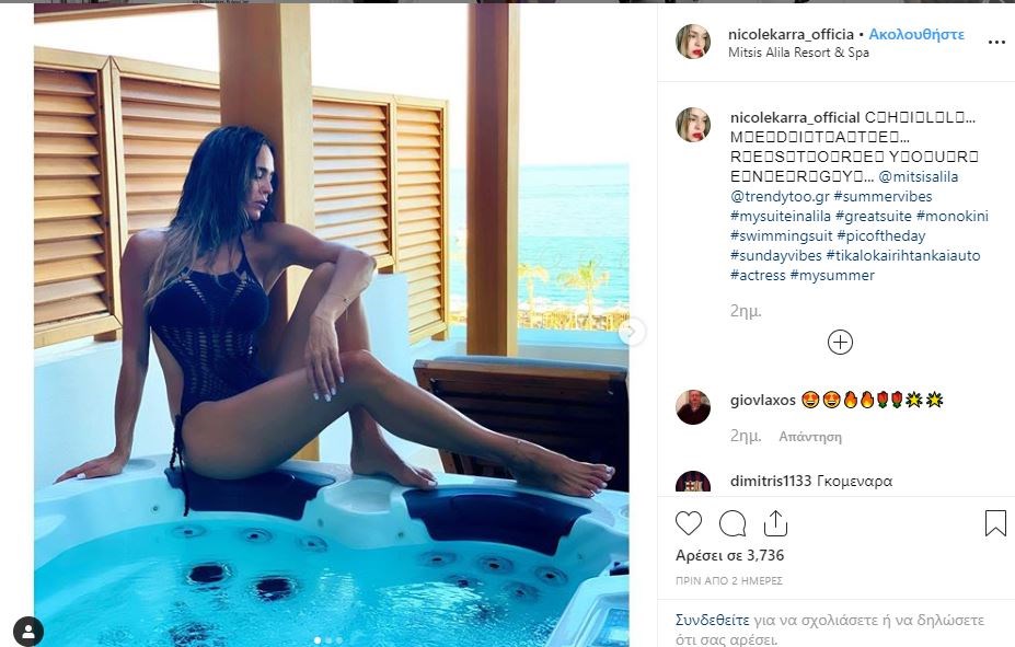 Συνεχίζει να ανεβάζει φωτογραφίες και να “τρελαίνει” το Instagram η Νικολέττα Καρρά. Η όμορφη μελαχρινή ηθοποιός ανάρτησε αυτή τη φορά μια φωτογραφία της με μαύρο αποκαλυπτικό μαγιό που αναδεικνύει το καλογυμνασμένο σώμα της, δίπλα στο τζακούζι και τα θετικά σχόλια των followers έπεσαν βροχή.