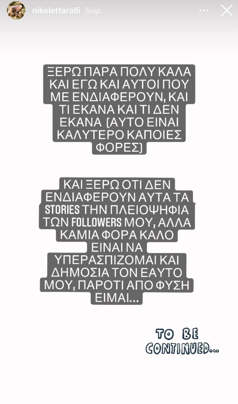 Ξέρω πάρα πολύ καλά και εγώ και αυτοί που με ενδιαφέρουν, και τι έκανα και τι δεν έκανα (αυτό είναι καλύτερο κάποιες φορές). Και ξέρω ότι δεν ενδιαφέρουν αυτά τα stories την πλειοψηφία των followers μου, αλλά καμιά φορά καλό είναι να υπερασπίζομαι και δημόσια τον εαυτό μου, παρότι από φύση είμαι…”.