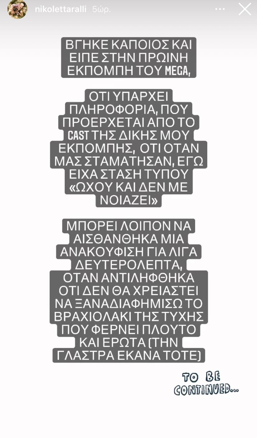 Συγκεκριμένα, κατά τη διάρκεια της εκπομπής της Ελεονώρας Μελέτη την Παρασκευή, προβλήθηκε ένα ρεπορτάζ σχετικά με το πρόωρο τέλος της εκπομπής της Νικολέττας Ράλλη. Αυτό πυροδότησε την αντίδραση της Νικολέττας Ράλλη, η οποία και “ήρθε” μέσα από τον προσωπικό της λογαριασμό στο Instagram.