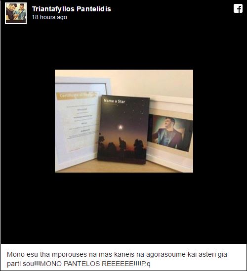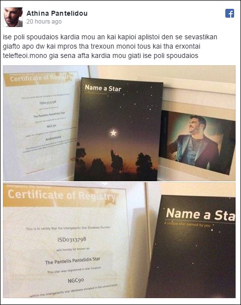 Η οικογένεια του Παντελή Παντελίδη βρήκε έναν ιδιαίτερο τρόπο για μείνει στην αιωνιότητα ο άτυχος τραγουδιστής. Αγόρασαν ένα αστέρι προς τιμήν του από εταιρεία του εξωτερικού και το ονόμασαν “Παντελής Παντελίδης”.