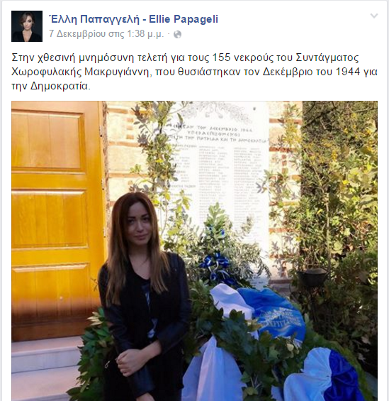 Η “διάσημη” ΟΝΝΕΔίτισσα – μοντέλο, Έλλη Παπαγγελή, στις 6 Δεκεμβρίου, βρέθηκε στη μνημόσυνη τελετή για τους 155 νεκρούς του Συντάγματος Χωροφυλακής Μακρυγιάννη, που “θυσιάστηκαν τον Δεκέμβριο του 1944 για την Δημοκρατία”.