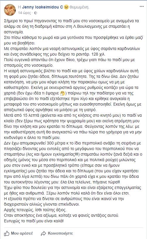 «Σήμερα το πρωί πηγαίνοντας το παιδί μου στο νοσοκομείο με αναμμένα τα αλάρμ σε όλη τη διαδρομή κάπου στη Λ. Βουλιαγμένης με σταματάει η αστυνομία.