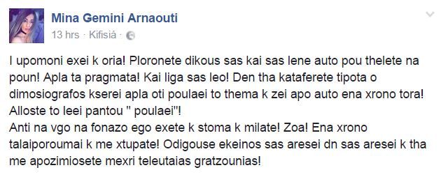 Με νέα ανάρτηση στον λογαριασμό της στο Facebook, η Μίνα Αρναούτη εκφράζει την οργή της σχετικά με όσα έρχονται στο φως της δημοσιότητας για το δυστύχημα στο οποίο έχασε τη ζωή του ο Παντελής Παντελίδης.