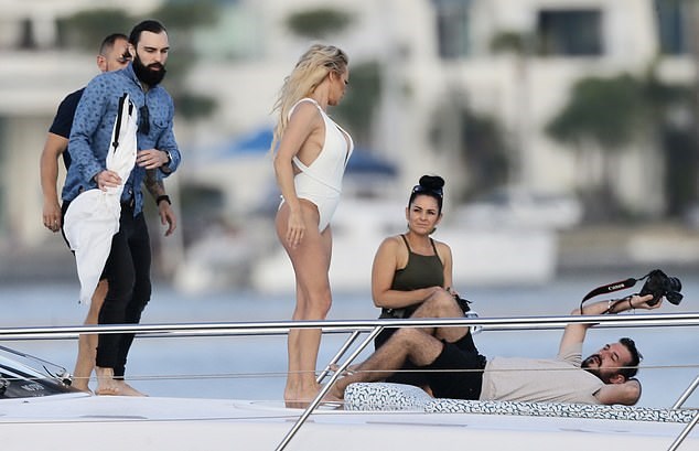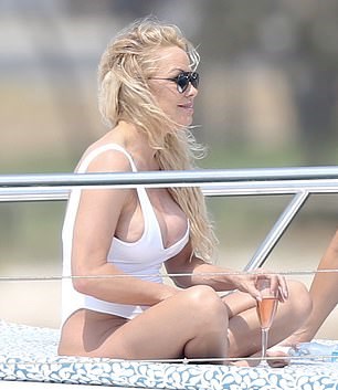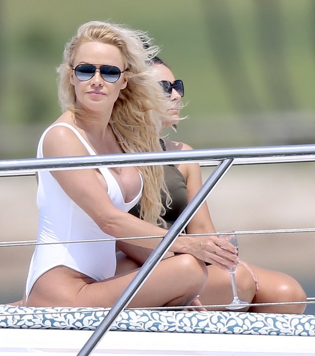Η Πάμελα φόρεσε ένα ολόσωμο λευκό μαγιό που τόνιζε τις επίμαχες θηλυκές καμπύλες που την καθιέρωσαν στη συνείδηση του αντρικού κοινού της και αναστάτωσε.