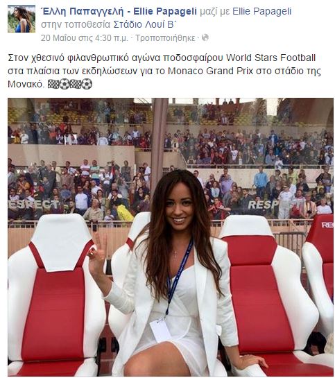 Στο Μονακό ταξίδεψε η Έλλη Παπαγγελή όπου απόλαυσε από κοντά τον φιλανθρωπικό αγώνα ποδοσφαίρου που πραγματοποιήθηκε μεταξύ των πιλότων της Formula 1 και αστέρων του παγκόσμιου αθλητισμού.