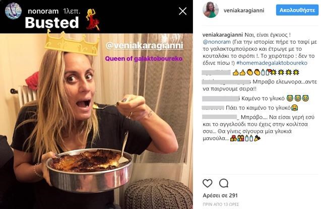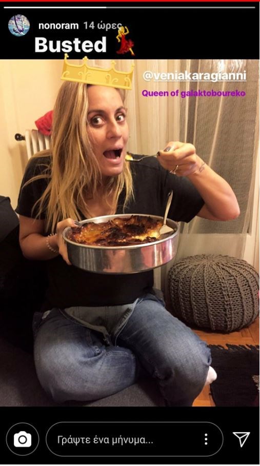 Το στιγμιότυπο κοινοποίησε στο προφίλ της και η φίλη της Βένια Καραγιάννη, γράφοντας στη λεζάντα: «Ναι, είναι έγκυος ! (Για την ιστορία: πήρε το ταψί με το γαλακτομπούρεκο και έτρωγε με το κουταλάκι το σιρόπι! Το χειρότερο: δεν το έδινε πίσω!)».