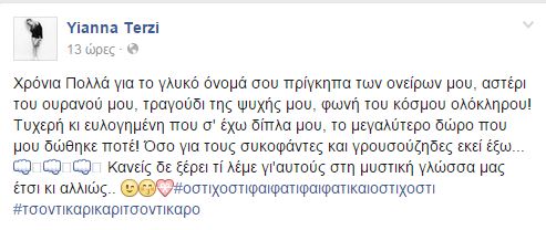 “Χρόνια Πολλά για το γλυκό όνομά σου πρίγκιπα των ονείρων μου, αστέρι του ουρανού μου τραγούδι της ψυχής, φωνή του κόσμου ολόκληρου! Τυχερή κι ευλογημένη που σε έχω δίπλα μου, το μεγαλύτερο δώρο που μου δόθηκε ποτέ! Όσο για τους συκοφάντες και γρουσούζηδες εκεί έξω… Κανείς δεν ξέρει τι λέμε γι αυτούς στη μυστική γλώσσα μας έτσι κι αλλιώς” έγραψε στο facebook.