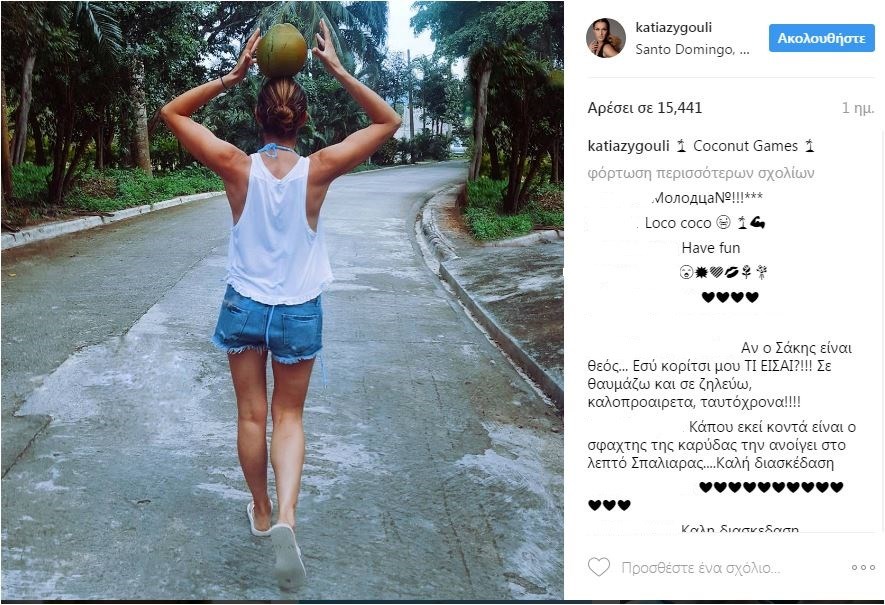 Η Κάτια Ζυγούλη, βρίσκεται εδώ και λίγες ημέρες μαζί με τον Σάκη Ρουβά στον Άγιο Δομίνικο, καθώς ο κορυφαίος Έλληνας σταρ, είναι επίσημος προσκεκλημένος του Τούρκου παραγωγού, Ατζούν Ιλιτζαλί, για τις «100 μέρες Survivor».Το ζευγάρι φαίνεται να απολαμβάνει τη διαμονή του στο εξωτικό νησί, αφού ανεβάζουν αρκετά συχνά φωτογραφίες στους προσωπικούς τους λογαριασμούς στα social media, από τις στιγμές χαλάρωσής τους, λίγο πριν ανέβουν τα σκαλιά της εκκλησίας.Το διάσημο μοντέλο, ανέβασε μία φωτογραφία στο Instagram, στην οποία περπατά, έχοντας μία… καρύδα στο κεφάλι! “Coconut games”, ήταν η λεζάντα που συνόδευε την ανάρτηση της.