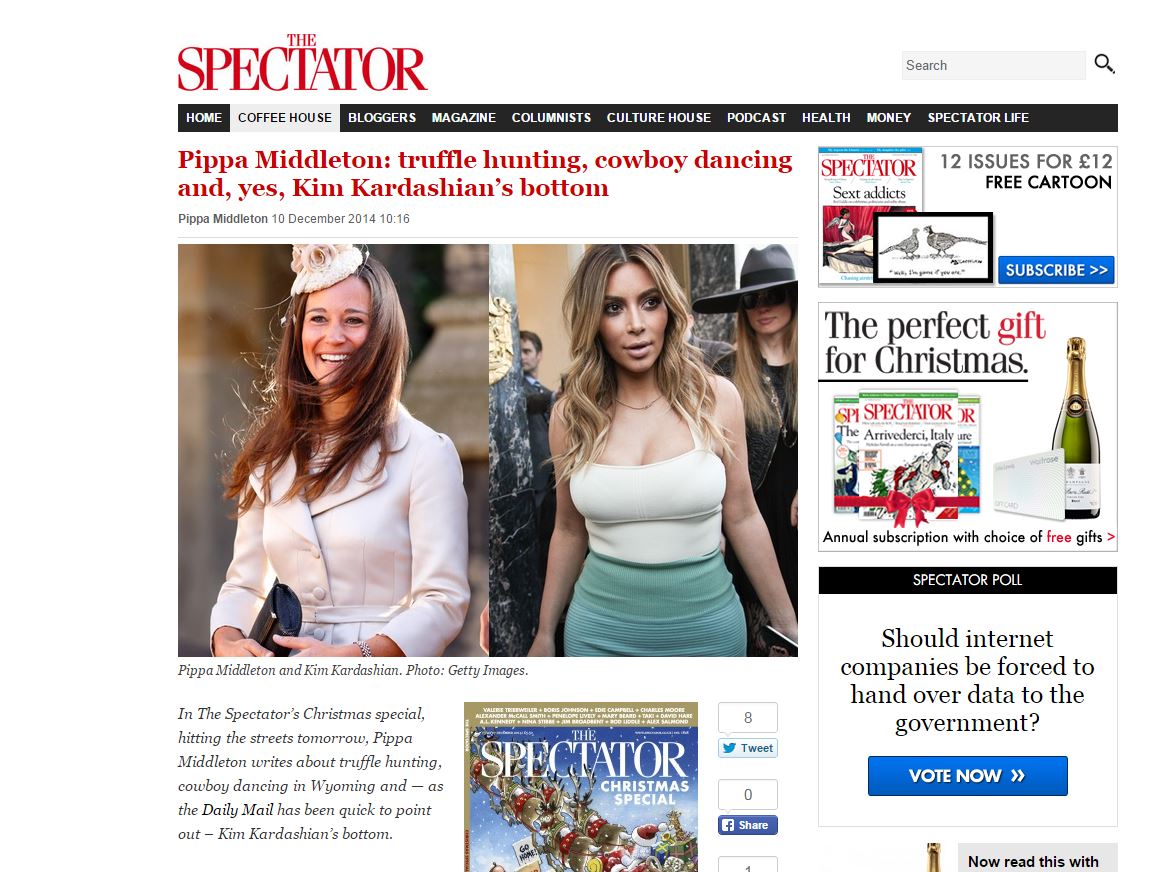 Με αφορμή την γυμνή φωτογράφιση της Κιμ Καρντάσιαν, η Πίπα Μίντλετον σχολίασε στο blog της Spectator ότι τα δικά στης οπίσθια δεν πιάνουν μία μπροστά σε αυτά της τηλεπερσόνας.