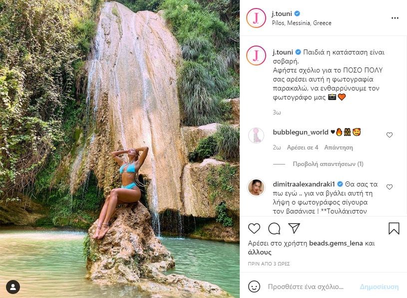 Λίγες ώρες πριν, σήμερα, ανέβασε πόζα της από το ίδιο σημείο η Ιωάννα Τούνη και μάλιστα ζήτησε από τους ακολούθους της να σχολιάσουν πόσο πολύ τους αρέσει η φωτογραφία για να ενθαρρύνουν τον φωτογράφο.
