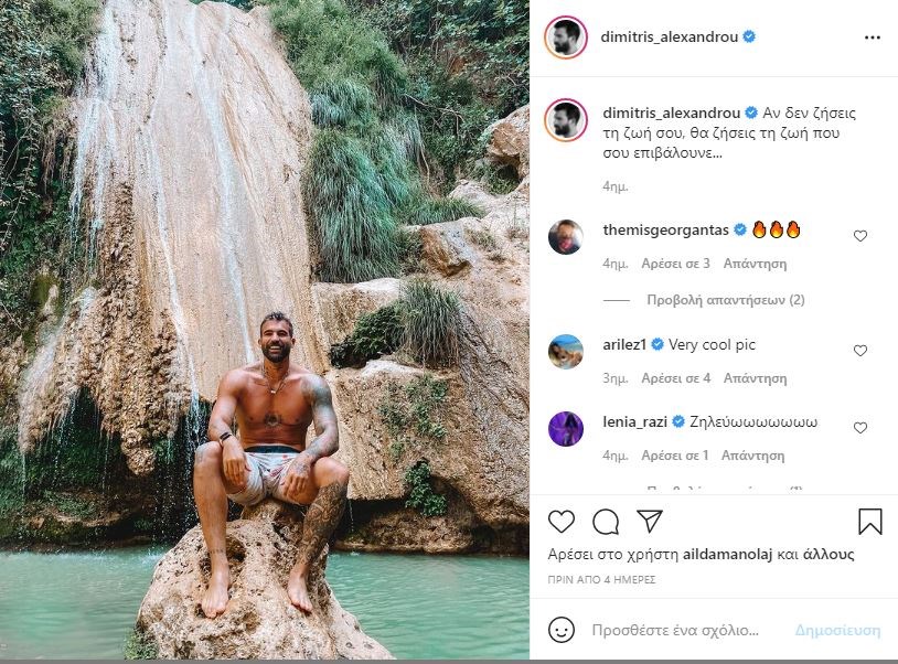 Πριν από τέσσερις ημέρες ο Δημήτρης Αλεξάνδρου ανέβασε στον λογαριασμό του στο instagram μία φωτογραφία όπου ποζάρει μπροστά στον Καταρράκτη Καλαμάρη στη Μεσσηνία.