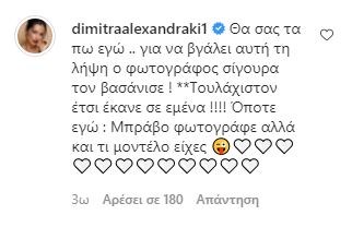 Η Δήμητρα Αλεξανδράκη, κολλητή της Ιωάννας Τούνη, έσπευσε να σχολιάσει: “Θα σας τα πω εγώ… για να βγάλει αυτή τη λήψη ο φωτογράφος σίγουρα τον βασάνισε! **Τουλάχιστον έτσι έκανε σε εμένα!!!! Οπότε εγώ: Μπράβο φωτογράφε αλλά και τι μοντέλο είχες”.