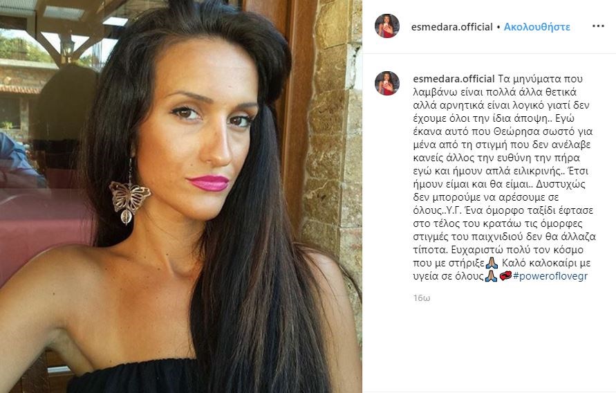 Μετά την έξοδο από το σπίτι της αγάπης ανέβασε μία φωτογραφία της στον προσωπικό της λογαριασμό στο Instagram και έγραψε: “Τα μηνύματα που λαμβάνω είναι πολλά άλλα θετικά, αλλά αρνητικά είναι λογικό γιατί δεν έχουμε όλοι την ίδια άποψη.. Εγώ έκανα αυτό που θεώρησα σωστό για μένα από τη στιγμή που δεν ανέλαβε κανείς άλλος την ευθύνη την πήρα εγώ και ήμουν απλά ειλικρινής.. Έτσι ήμουν, είμαι και θα είμαι.. Δυστυχώς δεν μπορούμε να αρέσουμε σε όλους..Υ.Γ. Ένα όμορφο ταξίδι έφτασε στο τέλος του κρατάω τις όμορφες στιγμές του παιχνιδιού δεν θα άλλαζα τίποτα. Ευχαριστώ πολύ τον κόσμο που με στήριξε. Καλό καλοκαίρι με υγεία σε όλους”.