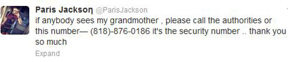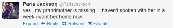 Η κόρη του Michael Jackson, Paris, ψάχνει τη γιαγιά της Katherine, που θεωρείται εδώ και δύο ώρες αγνοούμενη. Μέσω Twitter κάνει έκκληση για βοήθεια προς όποιον γνωρίζει κάτι που θα μπορούσε να βοηθήσει τις αρχές στον εντοπισμό της…