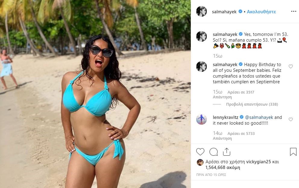 Η Σάλμα Χάγιεκ που έγινε 53 ετών ανέβασε χθες στον προσωπικό της λογαριασμό στο Instagram μία φωτογραφία στην οποία ποζάρει φορώντας ένα γαλάζιο μαγιό.