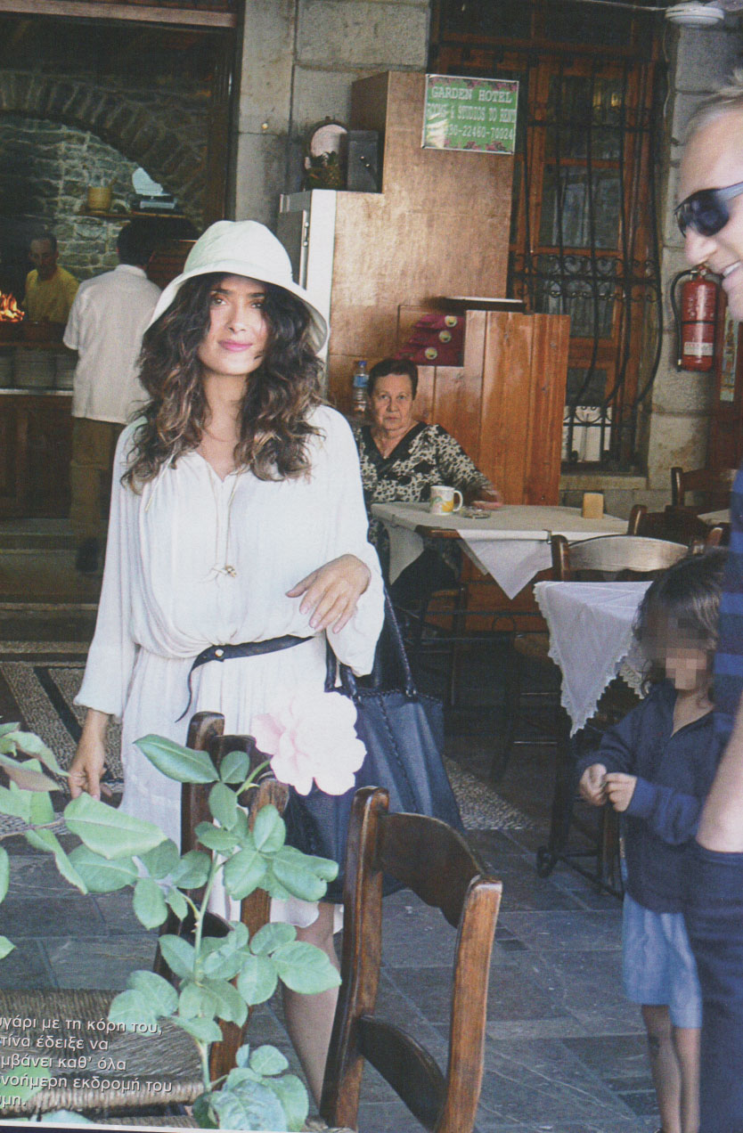 H Salma Hayek δοκίμασε τις μοναδικές θαλασσινές λιχουδιές, ήπιε την παγωμένη μαστίχα και φυσικά δοκίμασε τα ακούμια, ένα είδος λουκουμά. Η οικογένεια προτίμησε να μην κάνει μπάνιο, αφού ήθελε να εξερευνήσει τη Χώρα. Φυσικά, αγόρασαν και διάφορα αξεσουάρ, από τα μαγαζιά που έχουν ανοίξει για την καλοκαιρινή περίοδο.