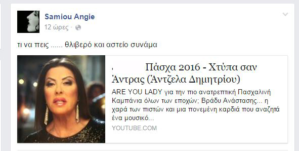 H Άντζυ Σαμίου σχολίασε αρνητικά την διαφήμιση στην οποία πρωταγωνιστεί η Άντζελα Δημητρίου, γράφοντας: “Τι να πεις..θλιβερό και αστείο συνάμα”.