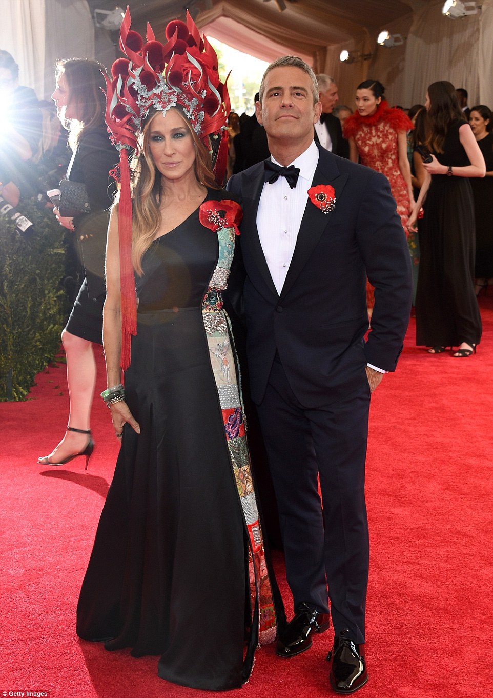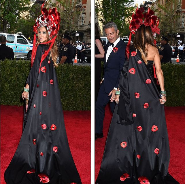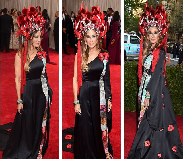 Η Πάρκερ επέλεξε να φορέσει μία μάξι μαύρη τουαλέτα και διακόσμησε το κεφάλι της με ένα στέμμα που έμοιαζε να βγάζει φλόγες και με μία κόκκινη φούντα να κρέμεται στο πλάι.