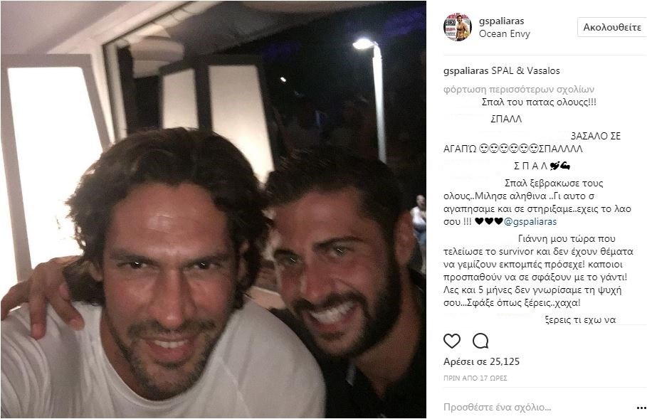 Μπορεί να τελείωσε το Survivor, όμως, όπως έχει αποδειχθεί, μέσα από το παιχνίδι δημιουργήθηκαν και ισχυροί δεσμοί φιλίας μεταξύ πολλών παικτών.Το βράδυ της Τετάρτης, οι δύο πρώην «Μαχητές», Γιάννης Σπαλιάρας και Κωνσταντίνος Βασάλος, πραγματοποίησαν έξοδο σε νυχτερινό μαγαζί, και μάλιστα ανέβασαν και ένα στιγμιότυπο στο Instagram. Οι δύο άνδρες φαίνεται να το διασκεδάζουν, ενώ η φωτογραφία απέσπασε χιλιάδες likes και σχόλια από θαυμαστές τους.